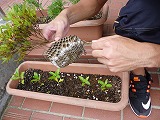 | 盆栽か? と思ったら・・・なんと,ハチの巣!! 学校前のツツジの木に,ハチの巣が作られていたのを,子供たちが発見しました! 生徒たちが刺されたら大変です。 大騒ぎになる前に撤収しました。 巣の中には,ハチの子が入っています。 それにしても,正確な六角形がきれいに並んでいますね。 | |
