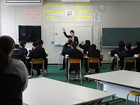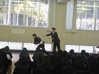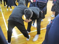 本日6限目、不審者対応避難訓練を行いました。 最近は、スマートフォンや携帯音楽プレイヤーを見ながら歩いたり、イヤホンで音楽を聴きながら歩く人がいます。 そのような行為は、意識がスマートフォンや携帯音楽プレイヤーに向いているため、自分に危険が近づいていても気が付かなかったり、素早い行動ができなかったりします。 また、万が一不審者に出会ってしまった場合、もしその人の特徴を覚えられる余裕があったら、はいている「くつ」を覚えるよう意識するとよいそうです。 不審者対応訓練では、簡単な護身術の練習もでき、大変有意義な時間となりました。 輪島警察署の方々には、大変お忙しい中、ご丁寧な講習会をありがとうございました。