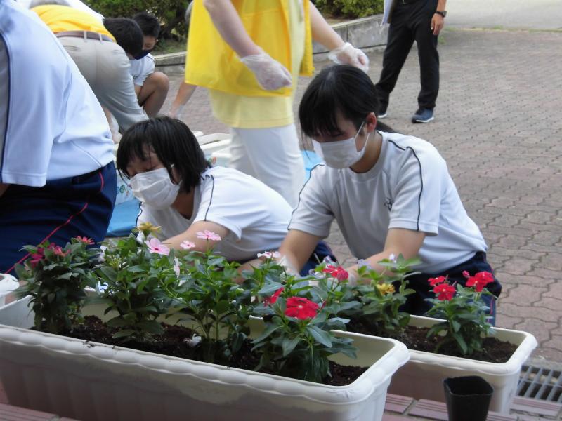 9月1日に本校で「人権の花贈呈式」が開かれ、輪島人権擁護委員協議会穴水部会から、百日草や日日草など80本の花をいただきました。 式には生徒会執行部が代表として受け取り、プランターに土を入れ、手作業で花を植えて水やりを行いました。式の中で、生徒会長は「新型コロナで医療に関わる人への差別が起きていると知った。暗い感情より、ありがとうを口に出したい。花をきっかけに全校で人権について考えていきたい。」と伝えました。