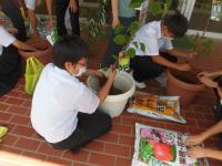 各代議員が代表して、その苗木を鉢に植え、玄関に配置しました。今年は、まだ実はなりませんが、学級の団結力という大きな実りをつけてほしいと思います。2学期は、学級、学年、学校の団結力が試される体育祭や文化祭などの大きな行事が控えています。みんなで力を合わせて、素敵な大きな実をを実らせて下さい。楽しみにしています。