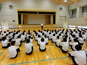 夏休みが始まって2週間がたちました。梅雨が明けて毎日暑い中、生徒は補充や部活、体育祭の準備などで、夏休み中もがんばっています。この日は全校登校日ということで、まず、壮行式が行われ、北信越・全国大会へ出場する選手へエールを送りました。その後、校長先生や生徒指導の先生からお話がありました。また、終戦記念日を前に学年ごとに平和教育が行われ、戦争の恐ろしさや平和のありがたさを再度確認しました。