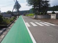 昨年度から、登下校の交通量が多く、子供たちの安全確保のために、町当局にお願いしていた緑色の歩道が完成しました。生徒が歩くことができる歩道を幅広く取っていただきました。ただ、その分、車道が狭くなり、車がすれ違いの際には、どうしても緑の報道に入ってしまいます。生徒には、歩道が広くなって歩きやすくなったが、車の状況をしっかり把握して、今までと同様に交通安全に気をつけるように伝えました。