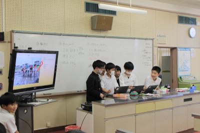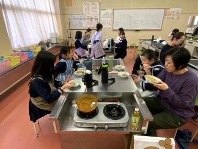 5年生が、米作り体験学習や学習支援でお世話になった地域の米多さん、佐々木さん、保護者の方、CSの方をお招きして、収穫祭を行いました。感謝の言葉やクイズのほかに、メインである収穫したお米を用いた料理を各クラスでグループに分かれて振る舞いました。1組は「炊き込みご飯」、2組は「カレーライス」です。途中、お客様にも手伝っていただきながら、無事完成!地元の特産品を使うなどアイデアを出し合い、協力して作った料理の出来栄えに、笑顔がこぼれました。自然の恵みと多くの人のおかげで、おいしいお米をいただけることにあらためて感謝の気持ちを抱きました。