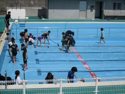 4.5年生が学校の代表として、プール掃除を行ってくれました。それぞれが自分の分担場所を責任をもってゴシゴシと磨き、壁面も床もみるみるうちにきれいにしていってくれました。今年は、4年生が初めて5限目にお手伝いをしてくれました。最後は5年生が責任をもってプールの隅々をきれいにしてくれました。下級生も教室の窓から応援してくれていましたね。4.5年生の皆さんの姿、頼もしかったですよ。このきれいになったプールでいよいよ6月16日(月)より水泳の授業が始まります。安全に楽しく泳力をつけていきましょうね。