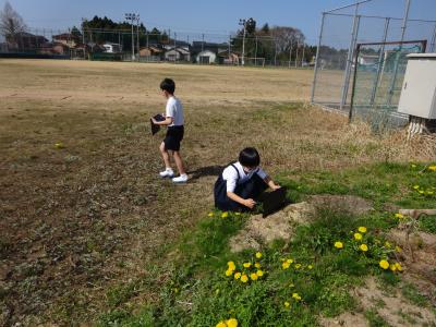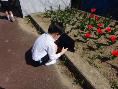 4月12日 (火) 2年生が「はるみつけ」に外へ出ました。PCを使ってチューリップやタンポポなど春に関係するものの写真を撮影し、観察していました。