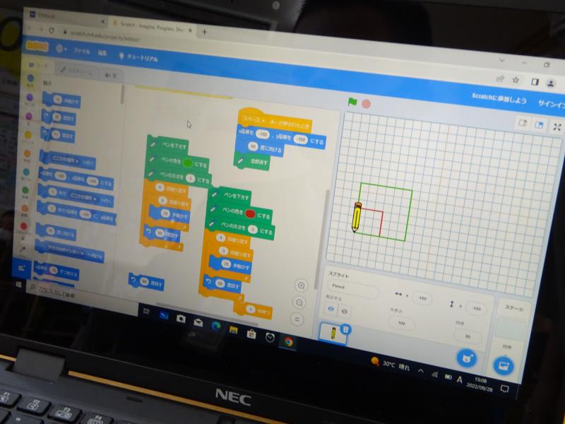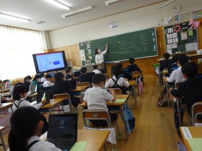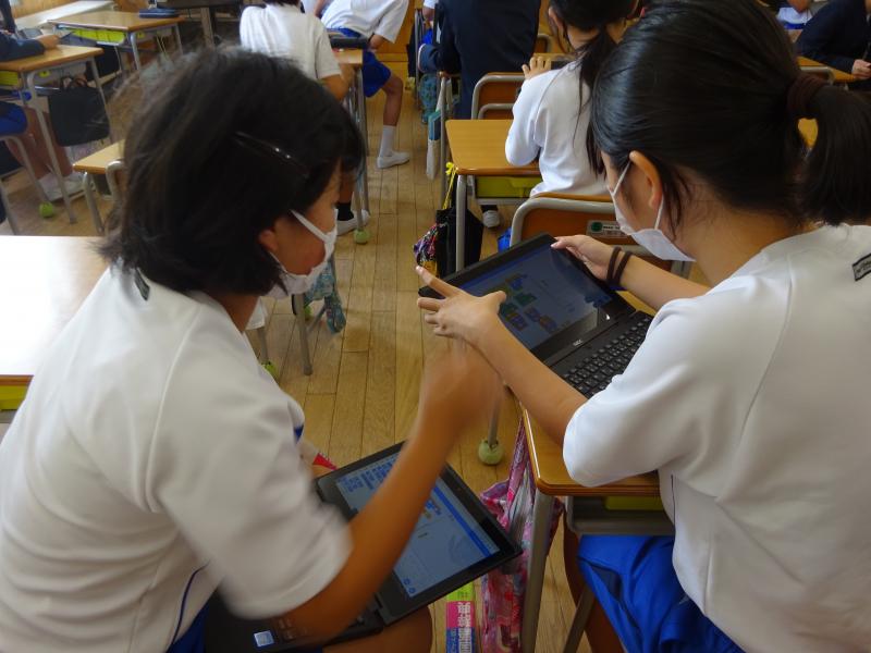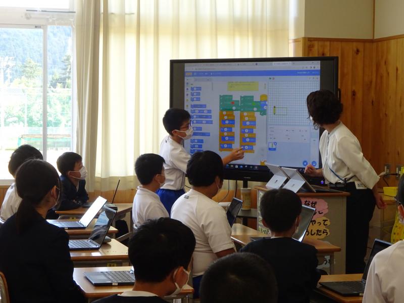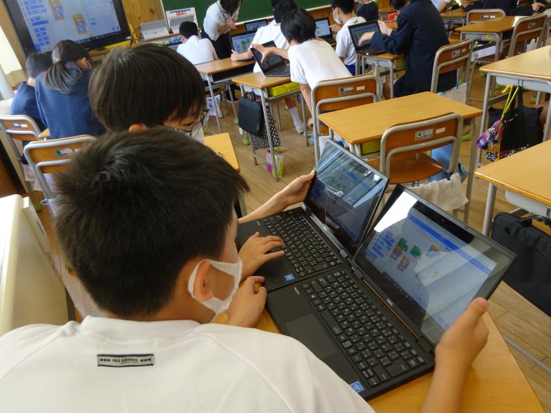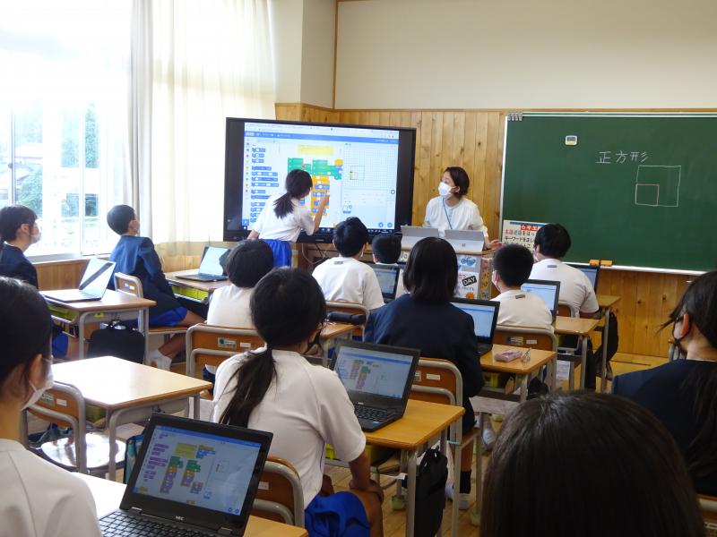 6年生は9月28日(水)に、ICTサポーターの安達先生とともに,scratchブラウザ版を利用し、プログラミングを活用して拡大図をかく学習をしました