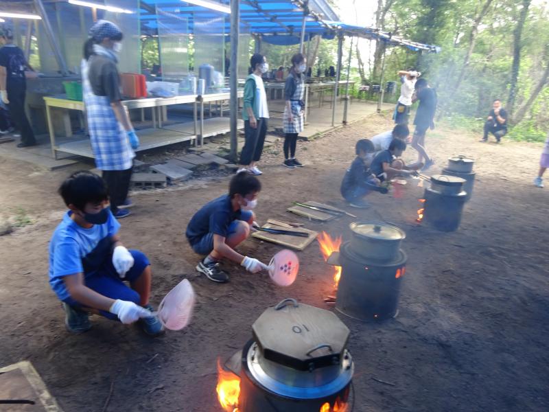 米とぎ・野菜切り・薪割り・火起こし・かまどで炊飯・かまどでカレー煮込み…と,