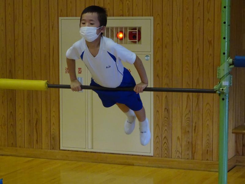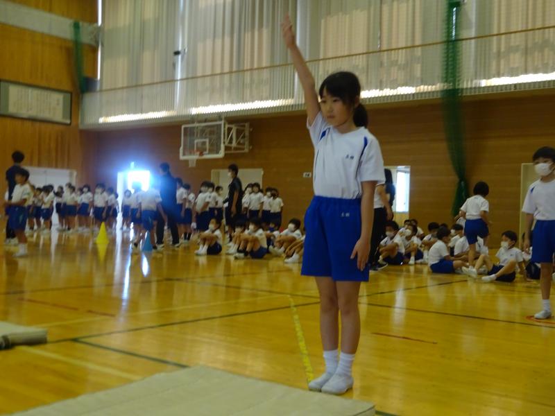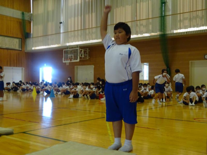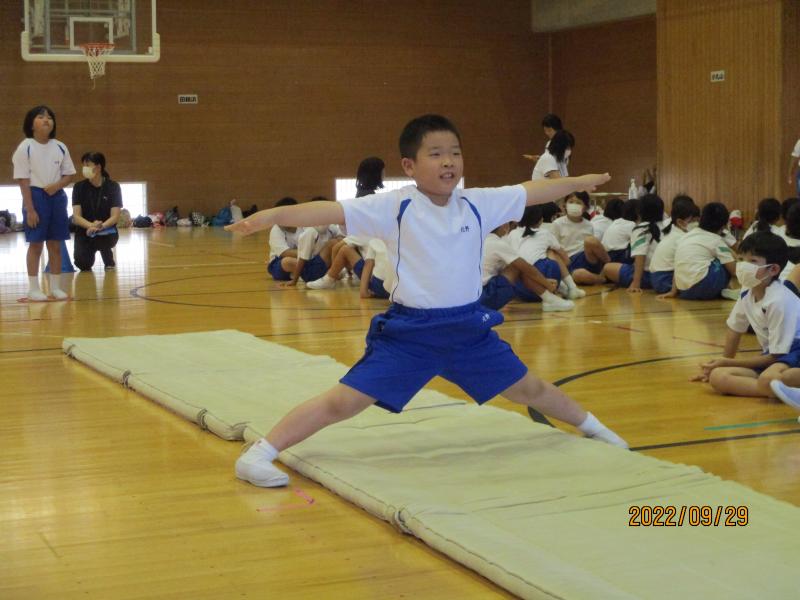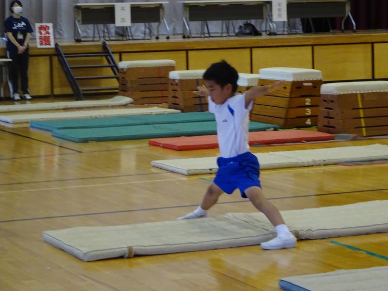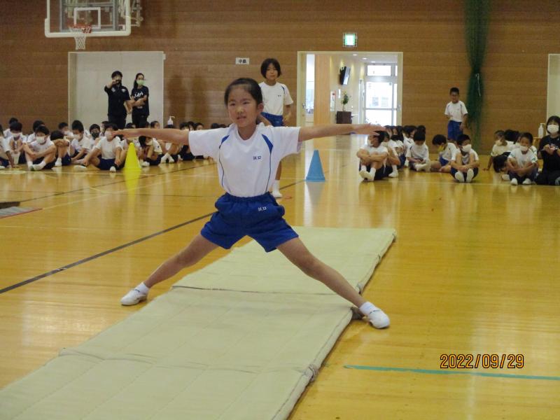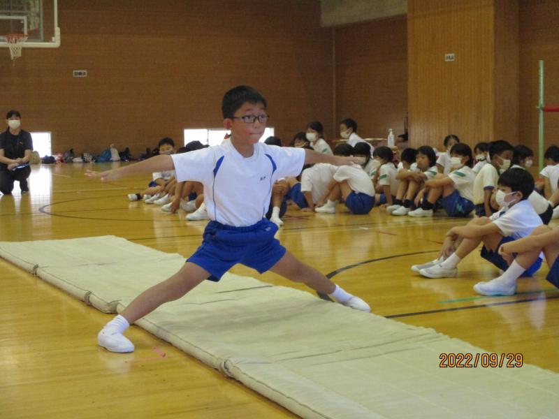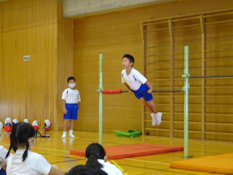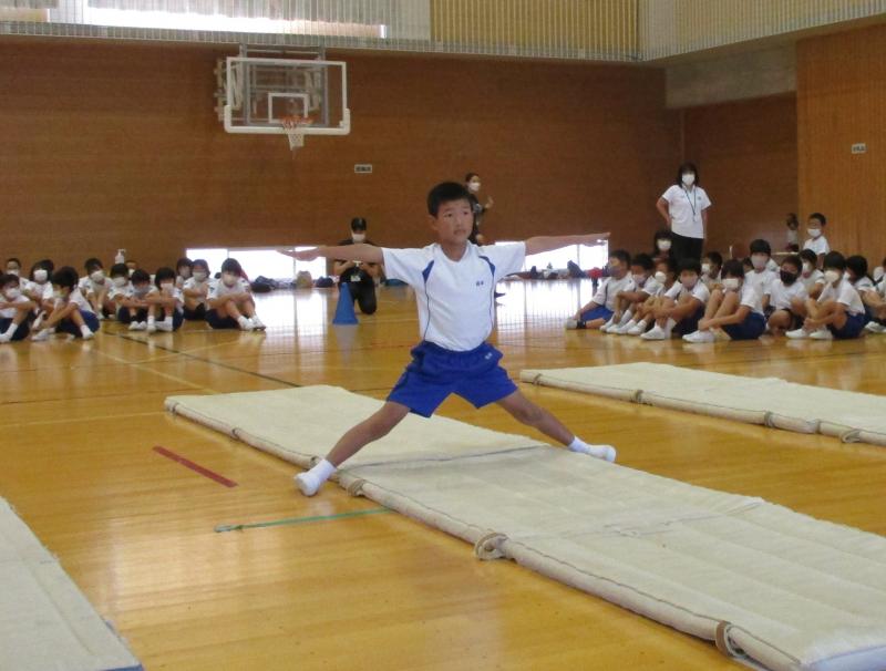 朝日小学校からの代表演技は,髙石果奈さん(鉄棒)・西田航さん(マット)が行いました。