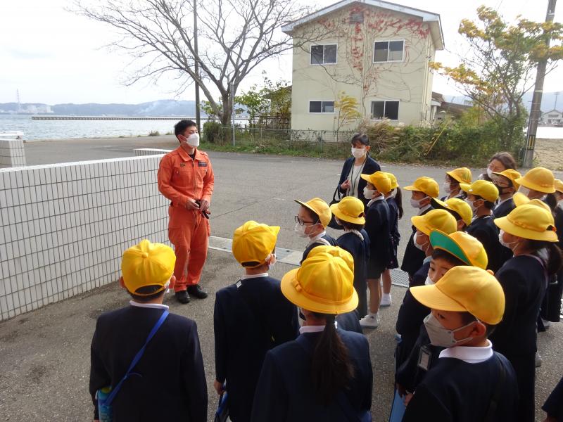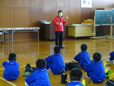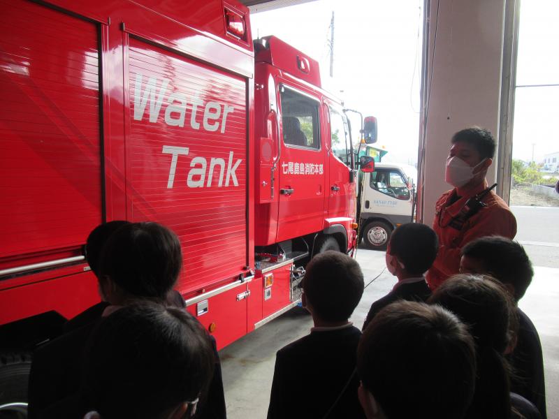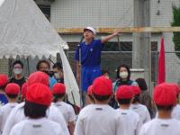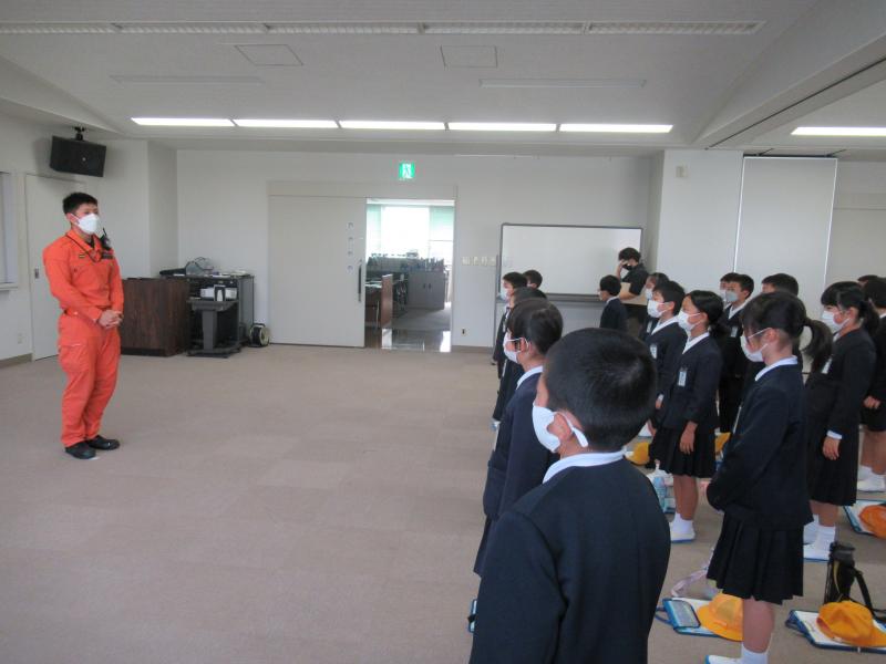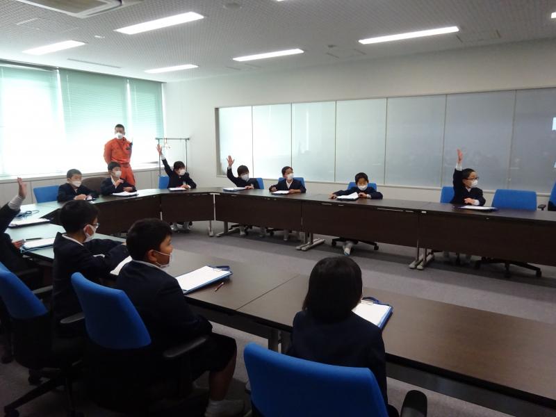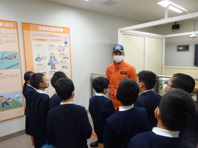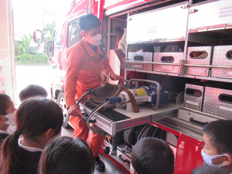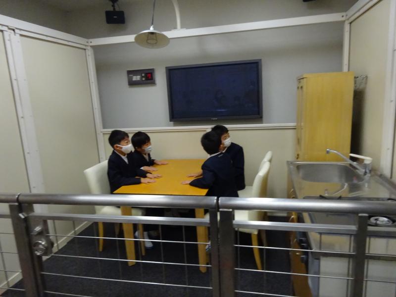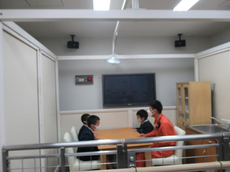 これまでの学習を通じて通信指令室,消防車を見学させていただき,消防士さんに質問をしたり,消防車について教えていただいたりしました。通信指令室の中が見えたとき,子どもたちは大興奮でした。電話番号を伝えて,自分の家がすぐに表示されたときも「すごーい」と声をあげていました。また,地震体験もさせていただきましたが,消防士さんに,何度も,「地震が起きたらまず机の下に入り,頭を守ることを忘れないでほしいと」言われていました。