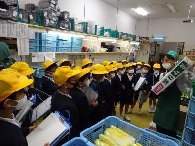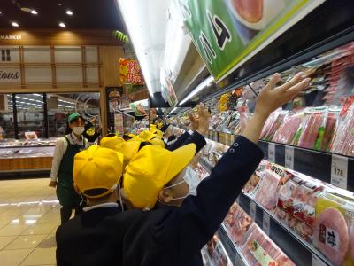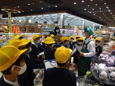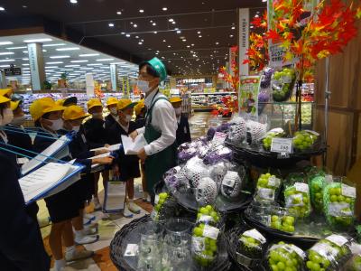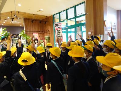 10月12日(水) どんたくアスティ店に社会科見学に行きました。スーパーマーケットの売り場の様子や働く人の様子について,また,お客さんのためのさまざまな工夫があることを沢田店長さんのお話を聞きながら学習しました。普段は決して見ることができない野菜・果物・魚・肉などのバックヤードも見せていただきました。店内見学の途中では,ピザ生地を高く回している実演も見ることができて子ども達は歓声をあげていました。