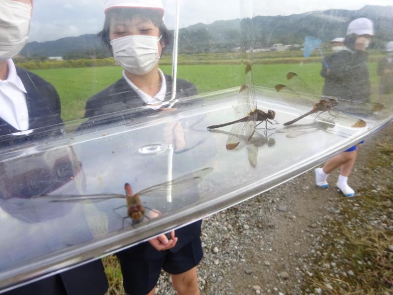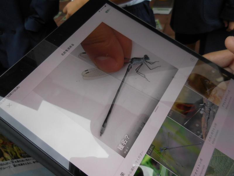 天気に恵まれなかったこともあり,実際に子供達が捕まえた赤トンボは2種類。イトトンボも2種類見つけました。アプリ「バイオーム」で特徴に注目しながら観察し,生き物登録をしました。普段運動場で見かける赤トンボは違う種類の可能性があることも教えていただきました。つがいで飛んでいる赤トンボもいました。水辺に産卵する種類と,飛びながら産卵する種類がいるそうです。運動場でつがいで飛んでいる赤トンボは産卵している可能性もあるそうです。