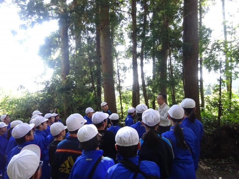まずチェーンソーで約25mの杉の木を伐採するところを実際に見せていただきました。多い時で一日に50本伐採するそうです。なぜ間伐をするのか等,健康な森・元気な森にするための活動について教えてもらいました。