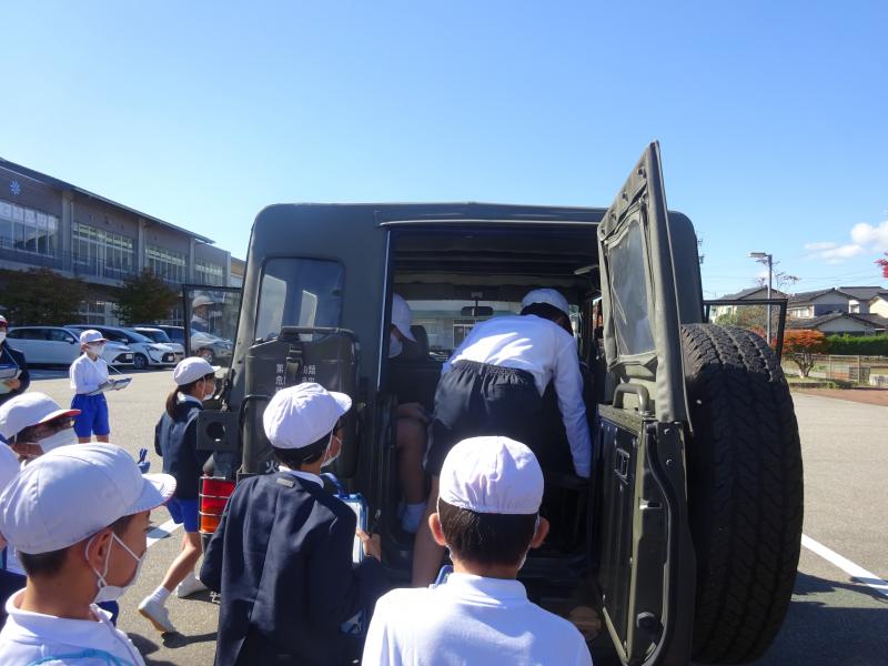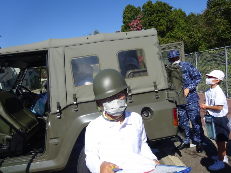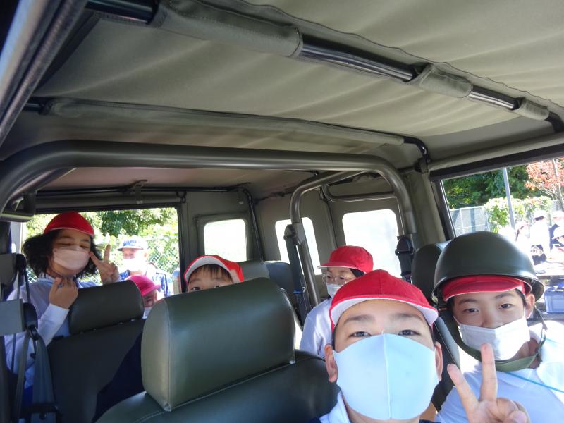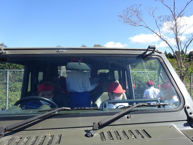 屋外の活動では,自衛隊が活動時に乗っている1/2トントラック(パジェロ)に実際に乗せてもらい,普通の車と違う所を見て,触って,確認することができました。また,災害時の非常食も見せてもらうことができました。水で非常食を加熱している時には,袋から湯気が上がった瞬間に子ども達から歓声が聞こえてきました。加熱した後のものを実際に見たり,触ったりしながら比べていました。