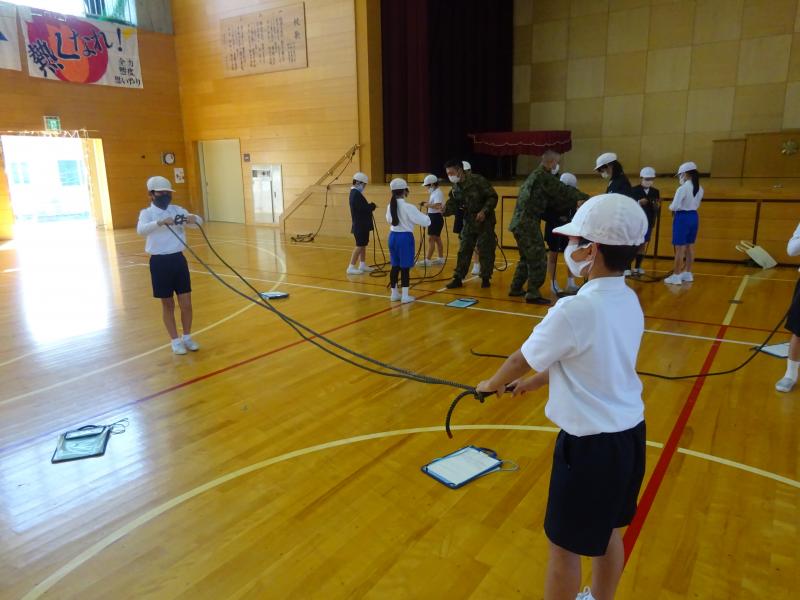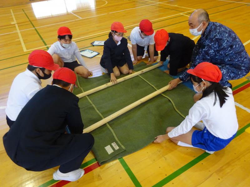 屋内の活動では,災害時に役立つ応急担架の作り方やロープの結び方を教えてもらいました。応急担架は棒2本と毛布1枚で大人も運ぶことができる担架を作り,自分たちで運びあっていました。ロープの結び方では2本のロープを長い1本にするための結び方を学び,自分たちで実践していました。