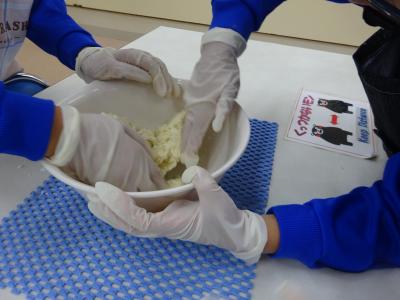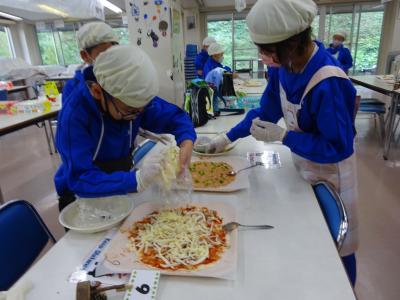 その後は,早速,今まで捨てられていたおからを使って3~4人のグループに分かれて,ピザ作り体験を行いました。まずは,野菜を調理ばさみを使ってカット。その後は,おからを入れた生地つくり,そしてトッピング。