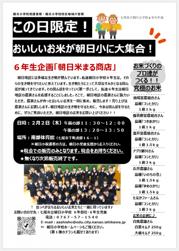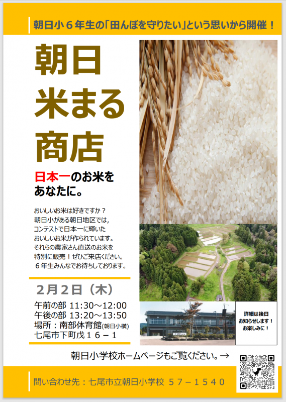 6年生企画「朝日米まる商店」が2月2日(木)に開催されます!!
