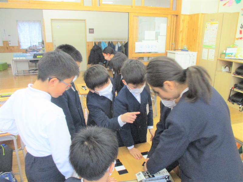 1年生は今日は算数の学習で「陣取りゲーム」をしていました。陣取りゲームは,広さの学習,つまり面積の学習につながります。1年生で「どちらがひろい?」と重ねて広さを比べます。それが4年生の面積の学習につながります。算数は特に,積み重ねの教科です。低学年のときから,いろいろな算数的活動をしながら,量感を養っていくことも大切です。お家でも,低学年は「どちらが多い?」「どちらが長い?」「どちらが重い?」「どちらが広い?」,単位を学習したら「どのくらいの長さ?」「どのくらいの長さ?」「どのくらいの重さ?」「どのくらいの広さ?」「どのくらいの量?」とクイズ形式で量感を育てることができます。