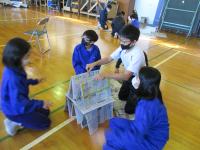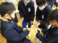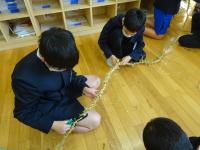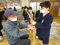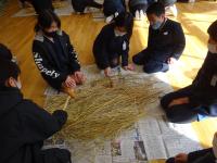 1月18日(火)七尾東雲高等学校の古川先生を講師にお招きし、バケツ稲のわらを使用し縄作りに挑戦しました。「1回ひねって 持ちかえる」を合言葉にどんどん長くなっていきました。短いわらでもよって繋げると長い縄になることを身をもって感じたのではないでしょうか。5年生は出来上がった縄で大縄跳びをして楽しんでいました。