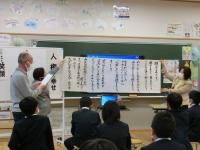 3年生が社会科の授業で市のうつりかわりの学習をしています。先日、青山智先生をゲストティチャーにお招きし、能登島の40年前について教えていただきました。子供たちは興味津々でした。