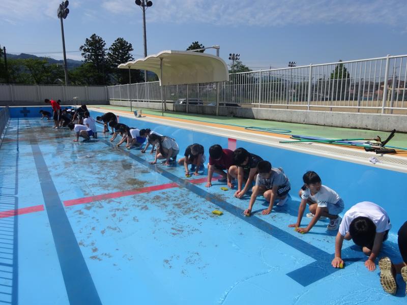 6月5日(月)5・6年生でプールの掃除をしました。5・6年生全校にきれいなプールに楽しく入って欲しいという思いを持って掃除に取り組んでいました。その甲斐もあり,プールサイドもプールの中も大変きれいになりました。来週からのプール開きが大変楽しみになりました。5・6年生ありがとう!