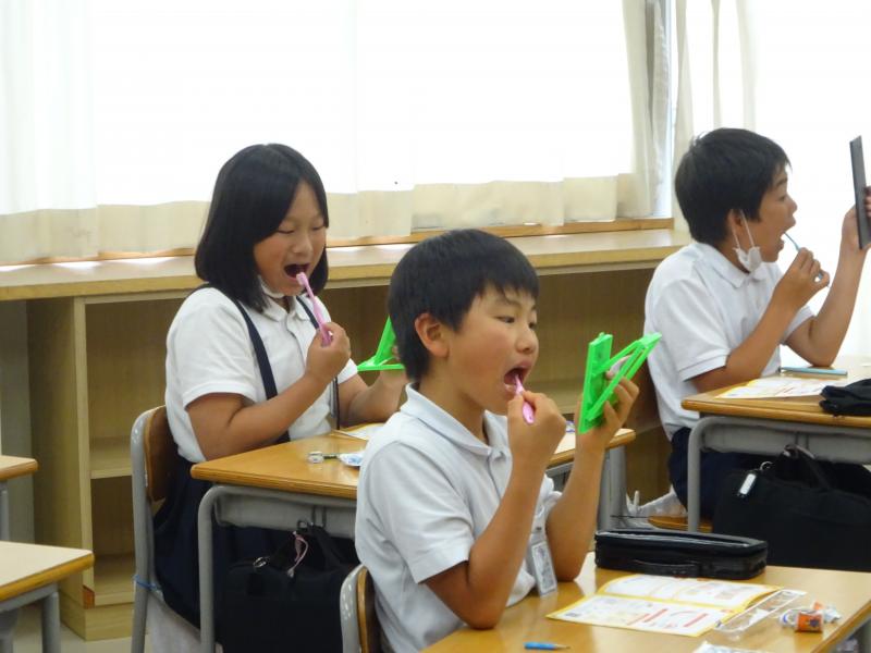 歯みがき大会では,「歯ぐきの病気」,「歯の表面についた白くネバネバしたものの正体」,「歯ブラシでみがききれない場所」,「歯みがきの基本とデンタルフロスの使い方」,「大人になっても歯ぐきを健康に保つには」を学びました。歯みがきクイズに答えたり,鏡を見て歯ぐきをチェックしたり,鏡を見ながら実際に歯みがきをしたり,デンタルフロスを使ったりしました。