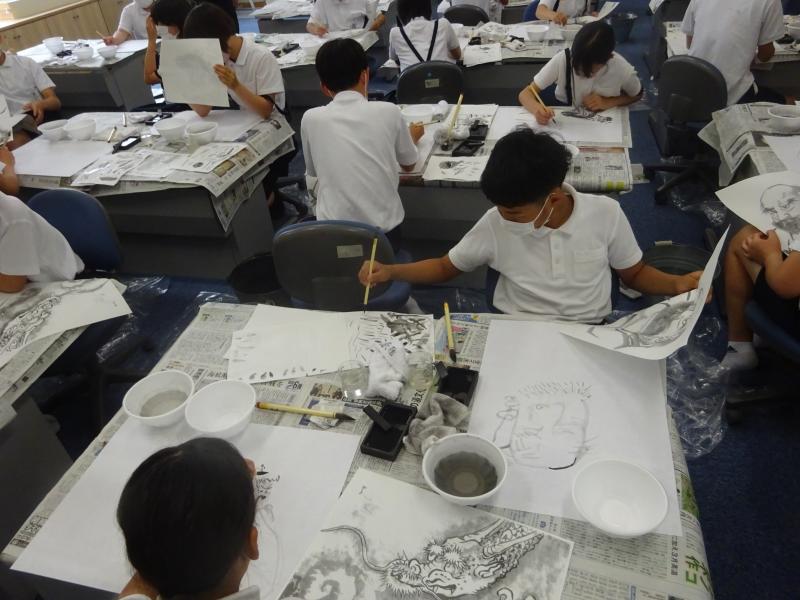 6月12日(月)6年生の図工の時間に講師の橋元道彦先生をお招きして水墨画教室を行いました。全員が初めての水墨画で緊張しながらのスタートでしたが,橋元先生の確実な指導と場を和ませるシャレを聞きながら子ども達も安心して水墨画に取り組んでいました。最後には,七尾出身の絵師・長谷川等伯の絵を思い切りよく描く姿が見られました。