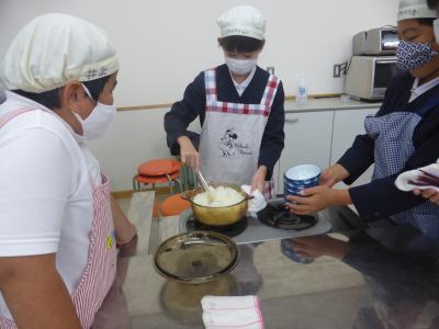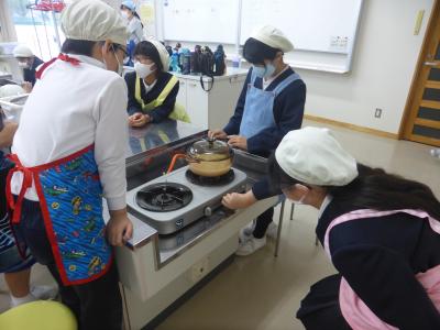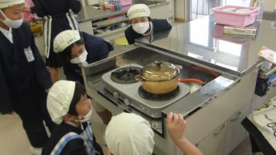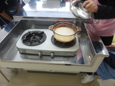 11月2日(月)5年生が家庭科でごはん炊きに挑戦しました。お米が炊けていく様子が見えるガラスの鍋で炊きました。5年生は炊きあがったごはんを、「おいしい、おいしい」と言いながら試食していました。