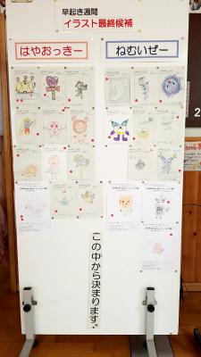早起き週間にイラストから最終選考候補になったイラストです。どれも力作です。この中からどのキャラクターが選ばれるでしょうか。