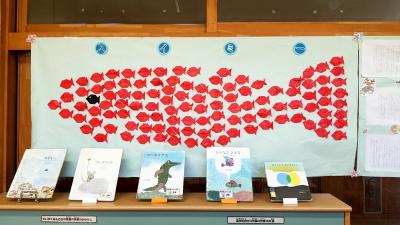 4年生が国語の「事実をもとに書かれた本を読もう」の学習で、読んで本の紹介のための本の帯などを製作しました。今、図書室前に飾られています。