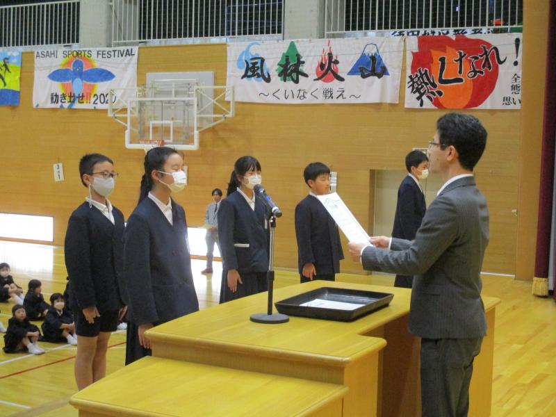 4月16日(火) 前期児童会の任命式を行いました。児童会の役員と各委員会の委員長は朝日小学校をこんな学校にしたいという思いをしっかりと話すとともに,よりよい学校にするためには,朝日っ子にこんなことをしてほしいというお願いを伝えていました。役員や委員長の話を聞いていた朝日っ子たちは、返事や態度でその思いにしっかりと応えていました。朝日っ子一丸となってよりよい学校にしていきましょう。