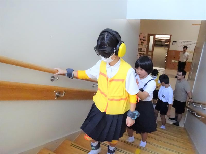 高齢者疑似体験を通して,「思った以上に体が重くて,腰や足が痛くなった。」「トイレをするためにしゃがむことも大変だと気付いた。」「自分たちの目と見える範囲が違うと気付いた」「字が見にくかった」「手がしわしわで新聞がめくりにくかった。」「くつをはくのも足が痛くて,がんばって履いた。」「階段の段差がよく見えず,足も上がりにくくてひっかかった。」「座ってから起き上がることも大変だった。「耳も聞こえにくいし,視界もさえぎられて,苦労した。」「サポートのために声をかけたけど,聞こえていなかった。」など,体験でしか得られないことを感じたり気付いたりしていました。