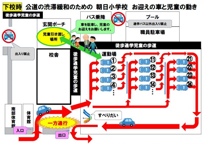 ※指定の場所以外での児童の乗降は、安全確保のためご遠慮ください。正門前で児童を降ろすことも,ご遠慮ください。
