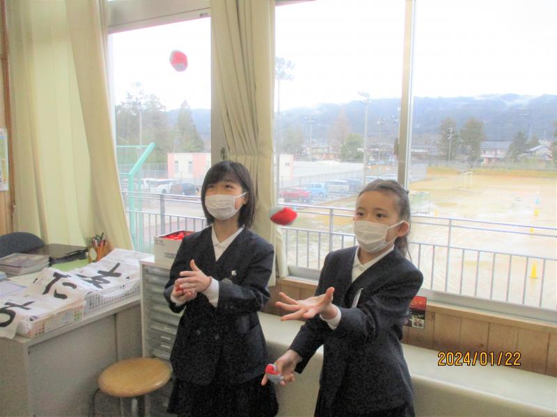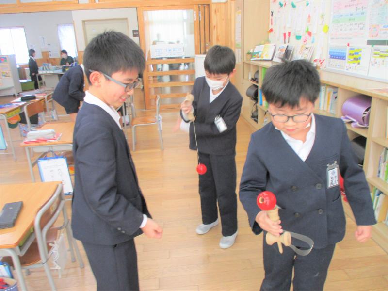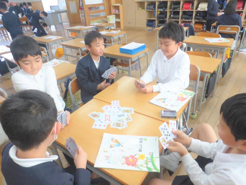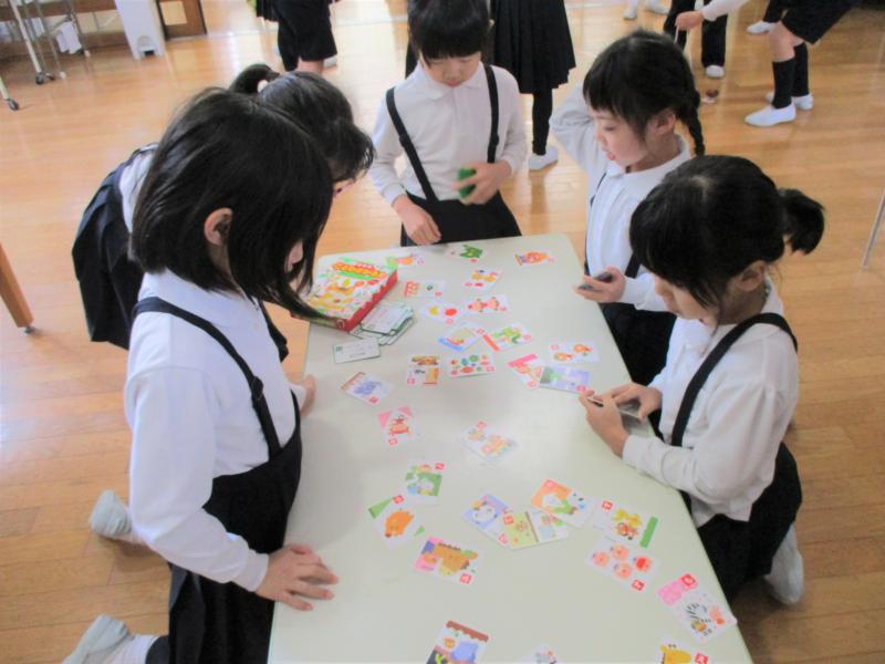 長休みは,体育館や運動場で遊べないため,けん玉,お手玉,トランプ,かるた,学習カードなどの「遊びグッズ」を準備しました。子供達はそれぞれ楽しそうに遊んでいました。
