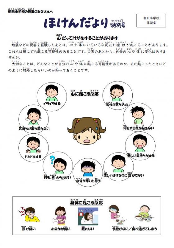 でも,先日,災害時学校支援チーム おかやま 災害支援員さんのお話を本校の養護教諭(保健の先生)が聞いてきた中に,「元気に見えることと,心の元気さは一致しない。だから心のケアが大切。」というお話がありました。自分や周りの人からは元気に思えていても,心は元気が無くなっている場合もあります。子どもも大人も一緒に,心のケアも大切にしていきましょう。