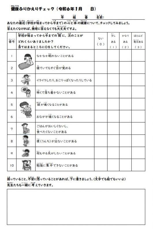 今日は「健康ふりかえりチェック」を,こころ元気アップタイムに行いました。この結果をもとに,より子どもたち一人一人の心のケアにつなげていきたいと思います。そして,定期的にこの「健康ふりかえチェック」を行っていきます。本日,お子さんに保健だよりとともに配付しましたので,お家でもお子さんと一緒にチェックしてみてください。