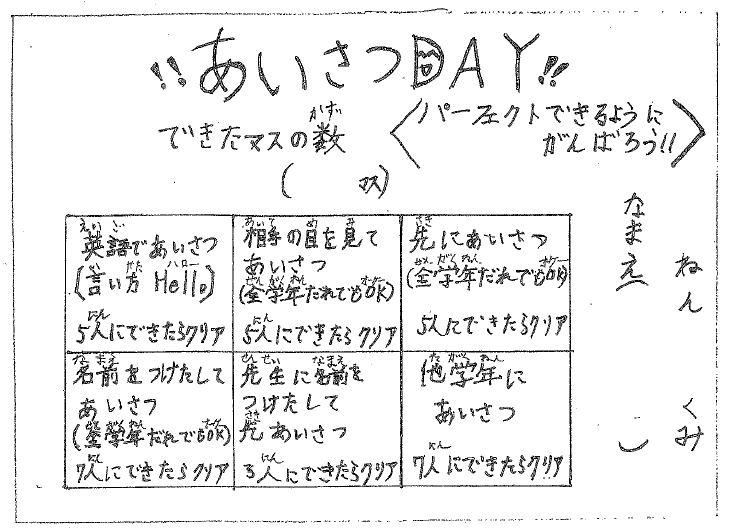 明日は「あいさつDAY」です。児童会が中心となって,朝日小学校児童が素敵なあいさつができるようにと,毎月取り組んでいるイベントです。毎月の取り組みでどんどん素敵なあいさつができる子が増えてきています。でも被災してから元気が無くなってきている面もあります。