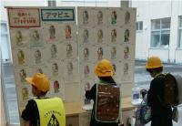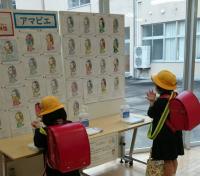 まず、登校した人から、ワンプッシュし、手指消毒をしてから教室へ向かいます。目の前にはお休み中に塗り絵をした「疫病から人々を守る妖怪 アマビエ」が、見守っています。
