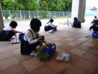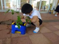 2年生はようやくミニトマトを植えることができました。朝顔を育てた経験を生かし、「どこからお水をあげようか」と考えていました。