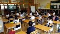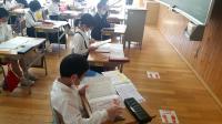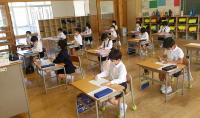 教室では、境の戸を開けたり外したりして間隔を空け、3密にならないようにして、学習しました。