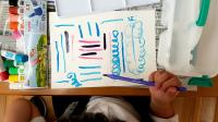 8月25日(火)2年生は、初めて自分の絵の具セットの絵の具を使いました。絵の具の出し方、水の入れ方などを学びました。おもいおもいの線等をうれしそうにかいていました。