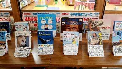 4年生が国語の「事実をもとに書かれた本を読もう」の学習で、読んで本の紹介のための本の帯などを製作しました。今、図書室前に飾られています。