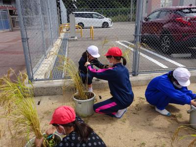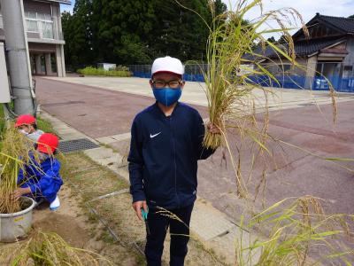 9月16日(水)、周囲から「いつ刈るのかな」と気にかけていただいていた5年生の稲刈りが行われました。収穫後、ハザ干しも体験しました。5年生は落ちたもみを一粒一粒大切に拾っていたそうです。