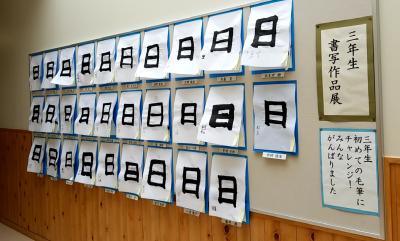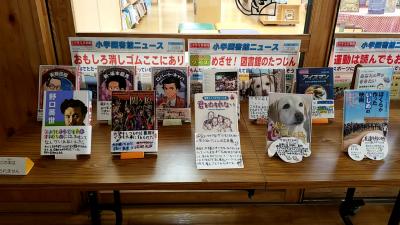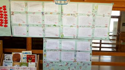 4年生が国語の「事実をもとに書かれた本を読もう」の学習で、読んで本の紹介のための本の帯などを製作しました。今、図書室前に飾られています。