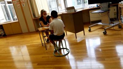 5・6年生は、外国語の単元毎に、ALTの先生と1対1で、単元で学んだ表現を話したり聞いたりするテスト(パフォーマンステスト)を行っています。話す力、聞く力をつけていくためのものです。だんだん上達しているようです。
