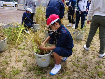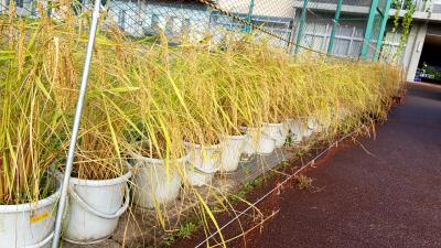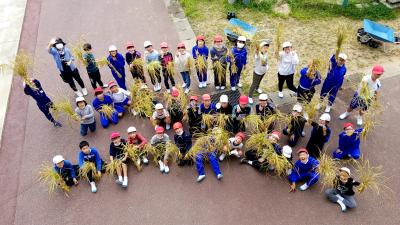 9月16日(水)、周囲から「いつ刈るのかな」と気にかけていただいていた5年生の稲刈りが行われました。収穫後、ハザ干しも体験しました。5年生は落ちたもみを一粒一粒大切に拾っていたそうです。
