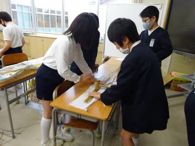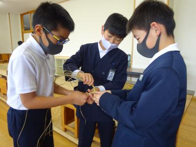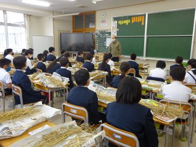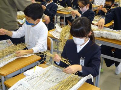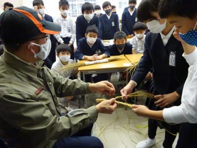 12月7日(月)、東雲高等学校の古川先生から、自分達が育てた稲のわらを使った縄作りを習いました。1日目は、1本1本わらを手に取り選び、縄を濡らして柔らかくし、さらに打って柔らかくしました。来週はいよいよ縄を編む活動です。どんな大繩が出来上がるか楽しみです。