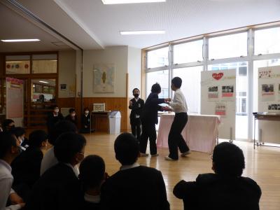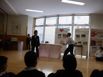 12月17日(木)の昼休み、エンターテイメントクラブが『朝日エンタメフェスティバル』を開催し、手品やお笑い芸を披露しました。寒い日でしたが、心がほっこりあったかくなりました。