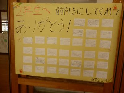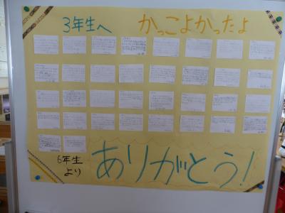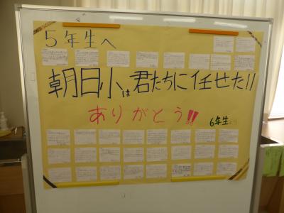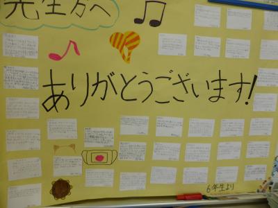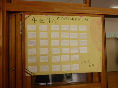 2月26日(金)6年生を送る会が終わった後、4年生が残って運営してくれた5年生に「ありがとう」を伝える姿が見られました。また、一度退場した6年生が「自分たちも片付けを手伝いたい」と戻ってきて5年生にお礼を伝えていました。6年生からは各教室、職員室にお礼のメッセージが届きました。