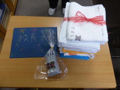 3月5日(金)6年生から感謝の手紙と自分たちで作ったハンカチのプレゼントが各先生方にありました。また、雑巾もプレゼントしてくれました。6年生、ありがとう!!