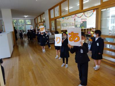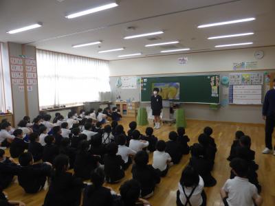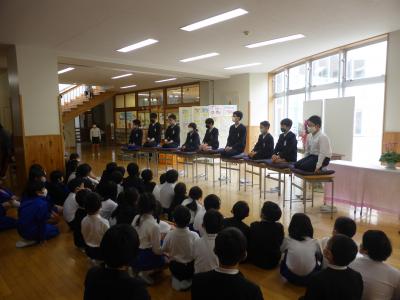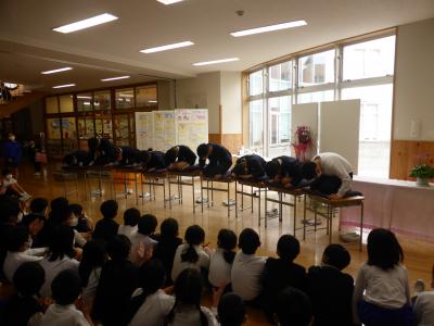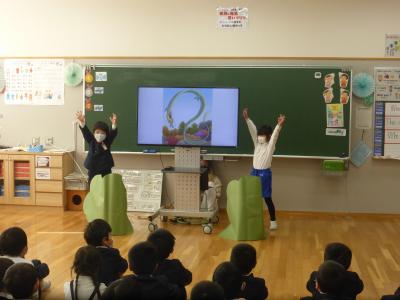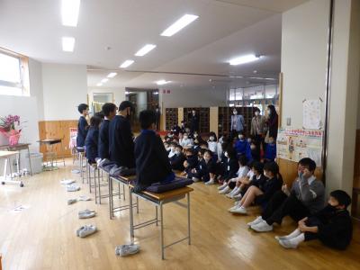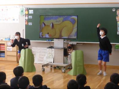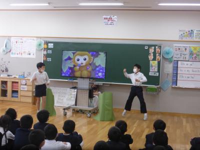 3月23日(火)、3年生が「Who are you?」の学習の劇を1・2年生に披露しました。身振り手振りを交えての熱演でした。1・2年も3年生の発表を見た感想をしっかり発表したいました。そして、この日がジェシカ先生の本校での最後の授業日となりました。3年生、ジェシカ先生ありがとう!